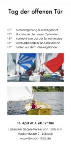 Mit auf dem Programm stehen die Taufen unseres neuen Vereinsoptimisten und des Bundesliga-Bootes, Präsentationen unseres Vereins samt seiner Anlagen (Bootshaus, Messe Restaurant Nordwind, Vereinsgelände Schanzenberg) und der in unserem Vereins vertretenen Boote, Schnuppersegeln usw. usw.