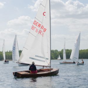 Am Sonntag besserte sich zwar das Wetter leider aber nicht der Wind. So hieß es in den ersten Stunden bei strahlendem Sonnenschein am Land warten. Um kurz vor 11 Uhr setzte sich dann eine leichte Brise (leider wieder aus West/Südwest) durch und es ging aufs Wasser. Während der Wettfahrt schlief der Wind immer weiter ein, so dass nach der ersten Runde am Gate gezeitet wurde. Wie gestern war dieses auch wieder nur bei den J 22 möglich. Da der See allmählich spiegelblank war, wurde die Wettfahrt für die O-Jollen abgebrochen.