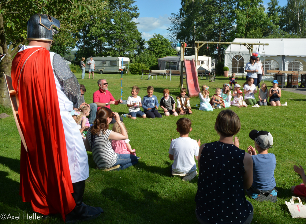 Fast 40 kleine Ritter und Prinzessinnen nahmen an den Ritterspielen teil und maßen sich beim Ringreiten, Schatzsuche, Apfelbeißen, Tauziehen, Balanceakten über dem Burgraben, Kirschenangeln, Drachenei laufen, Fischen, Ponyreiten, Ringe werfen, Stelzenlauf, Bällebad, Hüpfburg und vielem mehr. Die Erwachsenen labten sich an der reichlich gedeckten süßen Tafel mit vielen wunderbaren Torten- und Kuchenkreationen und beobachteten das bunte Treiben. Vielen Dank an dieser Stelle schon einmal an das Team für die tolle Kuchentafel!