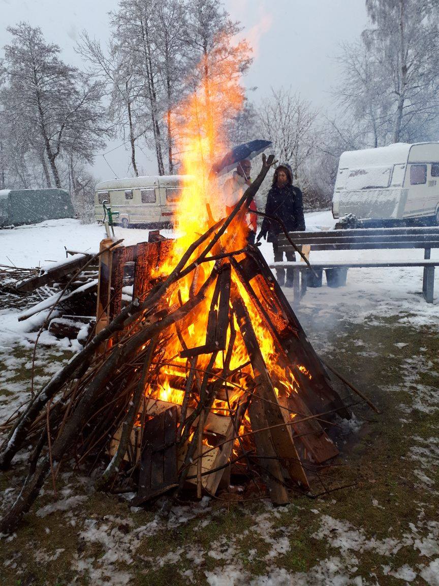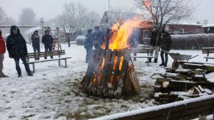 Nachdem das Feuer gegen 17 Uhr entzündet worden war, kamen die LSVer und Freunde aus den Nachbarvereinen zum gemeinsamen Grillen zusammen und verbrachten unter den Heizpilzen im Festzelt einen frohen Saisonauftakt. Ein herzlicher Dank geht an Jörn und Klaus, die das Feuer organisiert und zu diesem eingeladen hatten. Zudem sei auch allen Helferinnen und Helfern gedankt, die unter anderem unermüdlich den Schnee vom Zeltdach fegten.
