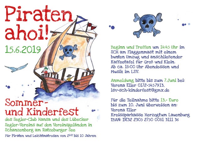Am 15. Juni erobern die jungen Piraten und Piratinnen den SCH und LSV. Noch bis zum 7. Juni können die Eltern ihre Kinder zu unserem diesjährigen Kinderfest anmelden. Alle Infos zur Anmeldung findet ihr auf dem Plakat.