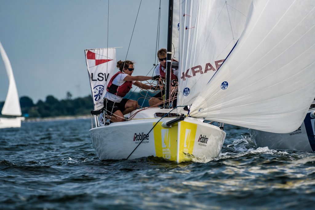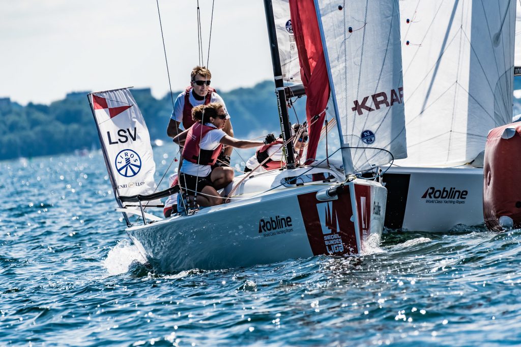 Bei leichten Winden kam das LSV Team bestehend aus Janne Schult, Nick Kössling, Niklas Reisenauer und Sönke Boy nicht recht in Fahrt, konnte aber immerhin in den wenigen Rennen mit mehr Wind andeuten, dass das Starkwind-Training sich doch gelohnt hat. Mit einem abschließenden 14. Platz ist das Team zwar nicht zufrieden, aber nicht auf einer Abstiegsposition.