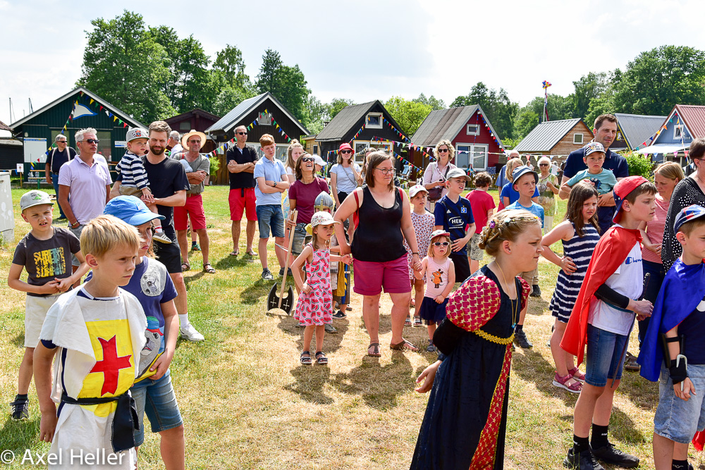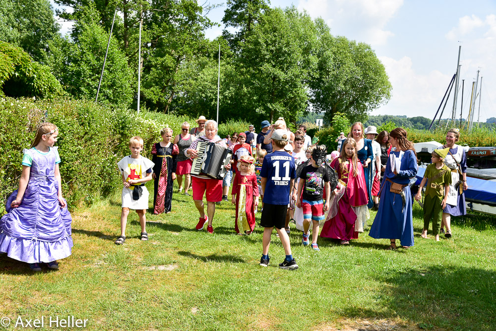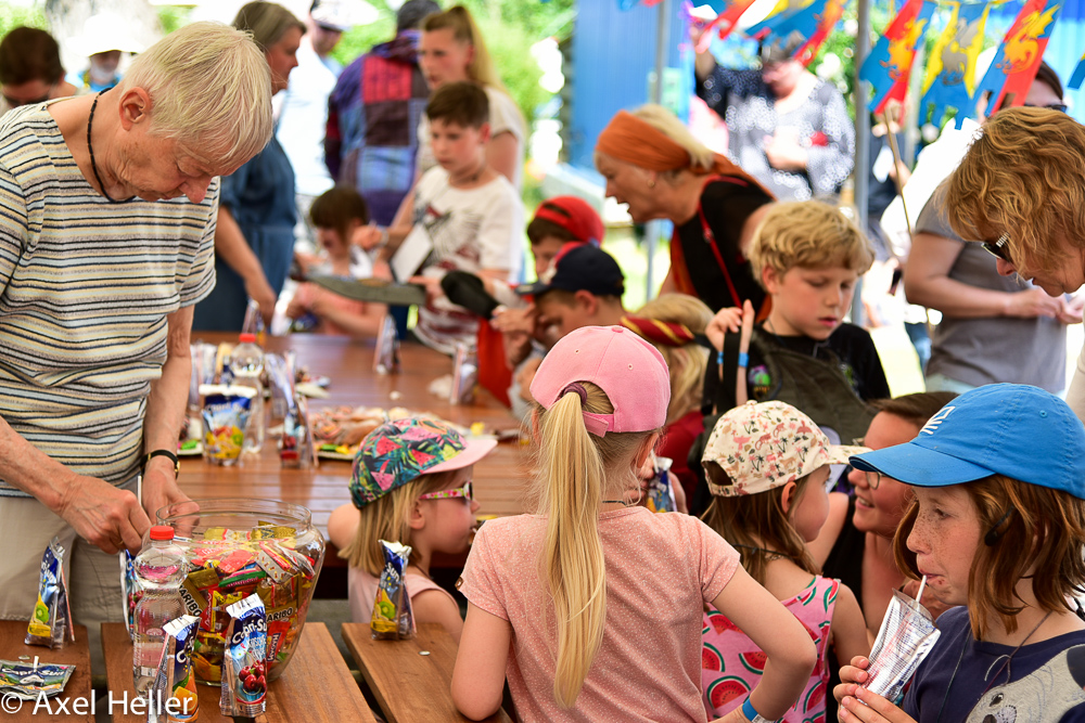 Am Vormittag hatten viele Mitstreiter und helfende Hände beide Vereinsgelände in fröhlich geschmückte Feststätten verwandelt. Um 15 Uhr konnten die Festlichkeiten dann mit einem kleinen Festumzug begleitet durch Barbara und ihr Akkordeon, der Begrüßung und einer reich gedeckten Kaffeetafel für Jung und Alt beim SCH beginnen. Frisch gestärkt machten sich die kleinen Burgbewohner anschließend an die zahlreichen Spiele auf dem Platz. Es wurde gebastelt, geschminkt, Kirschen geangelt, balanciert, Schätze gesucht, Fische geangelt, Schiffe wurden gewickelt, Bälle geworfen und vieles mehr, bevor dann am Abend der Umzug zum LSV erfolgte. Hier fand zunächst die heißersehnte Preisverteilung für die aktiven Kinder statt und danach das gemeinsame Essen vom Grill mit köstlichem Salatbuffet. Der schöne Festtag klang mit einer gut besuchten Kinder Disco, Bogenschießen, vielen netten Gesprächen an der Gurke und auf der Tanzfläche aus.