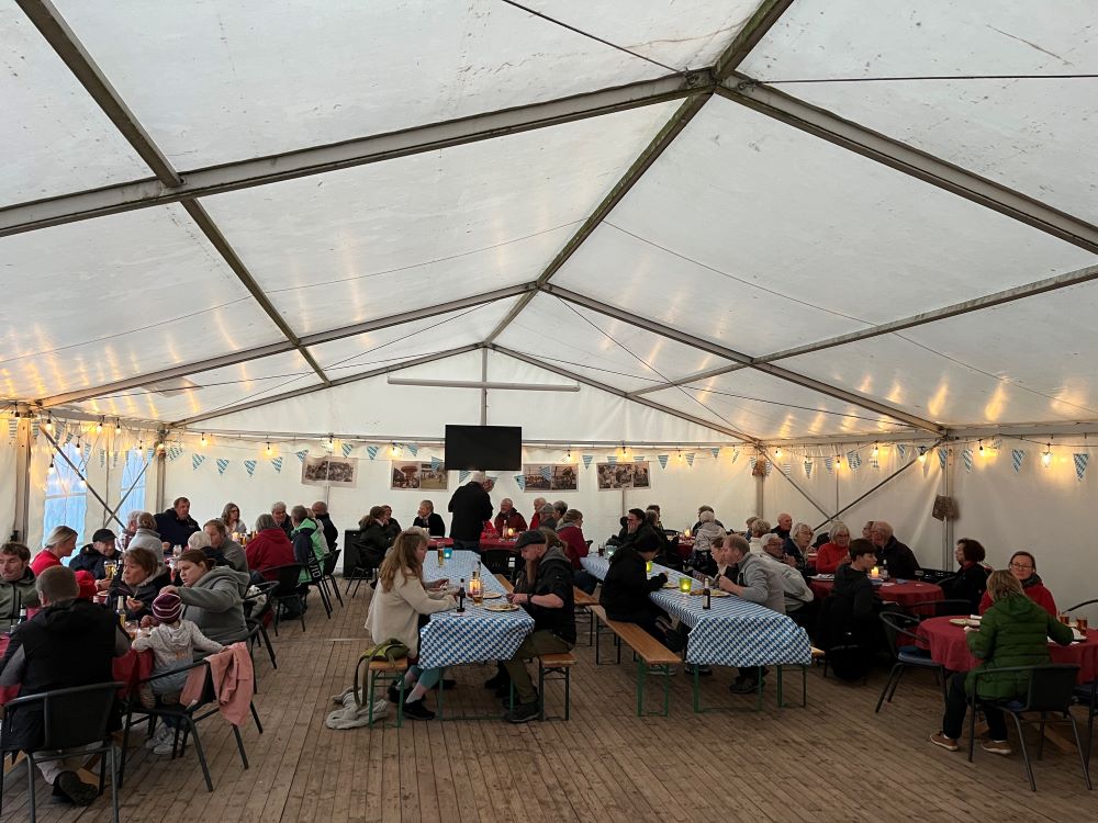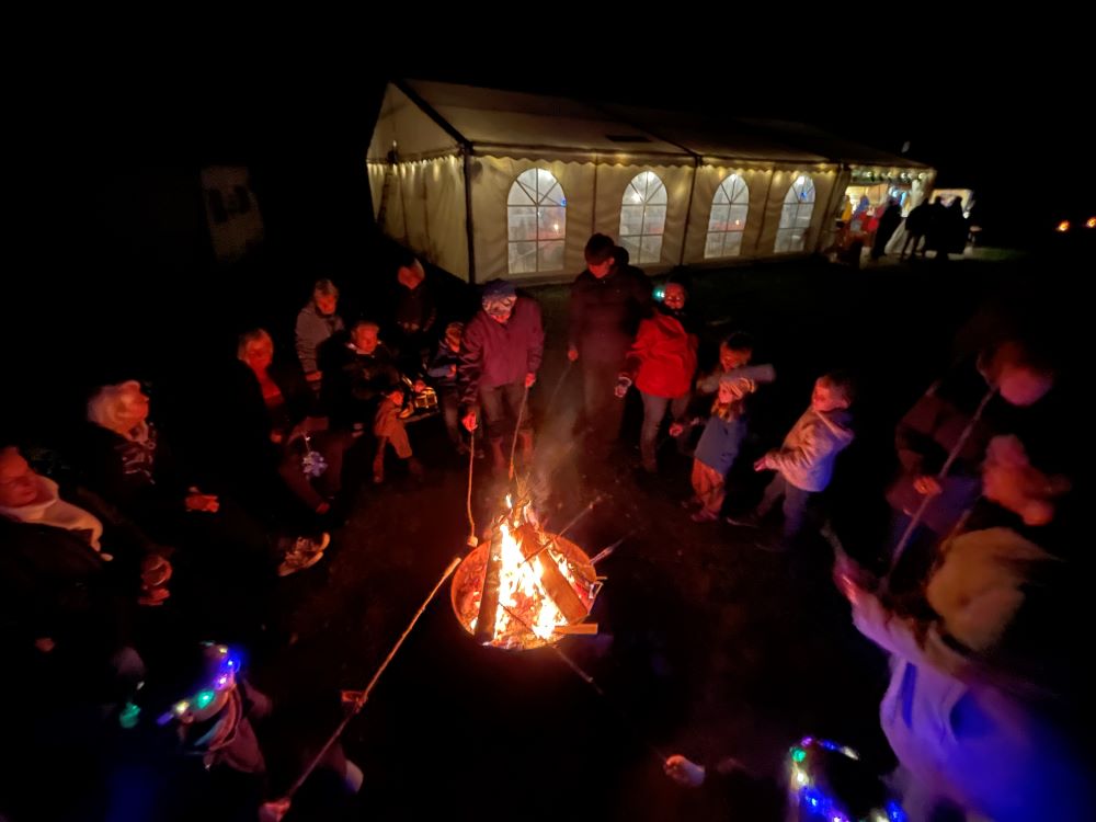 Am frühen Abend fanden sich über 65 erwachsene Teilnehmer und 15 Kinder im geschmückten Festzelt zu bayrischer Musik ein. Ein umfangreiches Buffet bestehend aus Leberkäse, Weißwurst, Sauerkraut, Kartoffel-, Gurken- und Wurstsalat, Schupfnudelpfanne, Obazda und Laugengebäck wurde ausgiebig genossen. Für die Kinder gab es zudem noch Hot Dogs. Es wurde geschnackt, gesungen, geschunkelt und auch ein bisschen getanzt. Die Dunkelheit läutete dann den zweiten Teil des Abends ein. Auf dem mit Lampions festlich beleuchteten Platz trafen sich die Kinder und Erwachsenen mit Ihren Laternen. Beim Laternen-Rundgang und abschließenden Treffen am Lagerfeuer wurde gemeinschaftlich gesungen. Dabei wurden nahezu vergessene Texte aus dem Gedächtnis gekramt. Barbara begleitete wieder auf ihrem Akkordeon und eine tolle Stimmung mit Wunderkerzen, Laternen, Lampions, Lagerfeuer und klarem Sternenhimmel vertrieben die Kälte des ersten kühleren Herbstabends des Jahres.