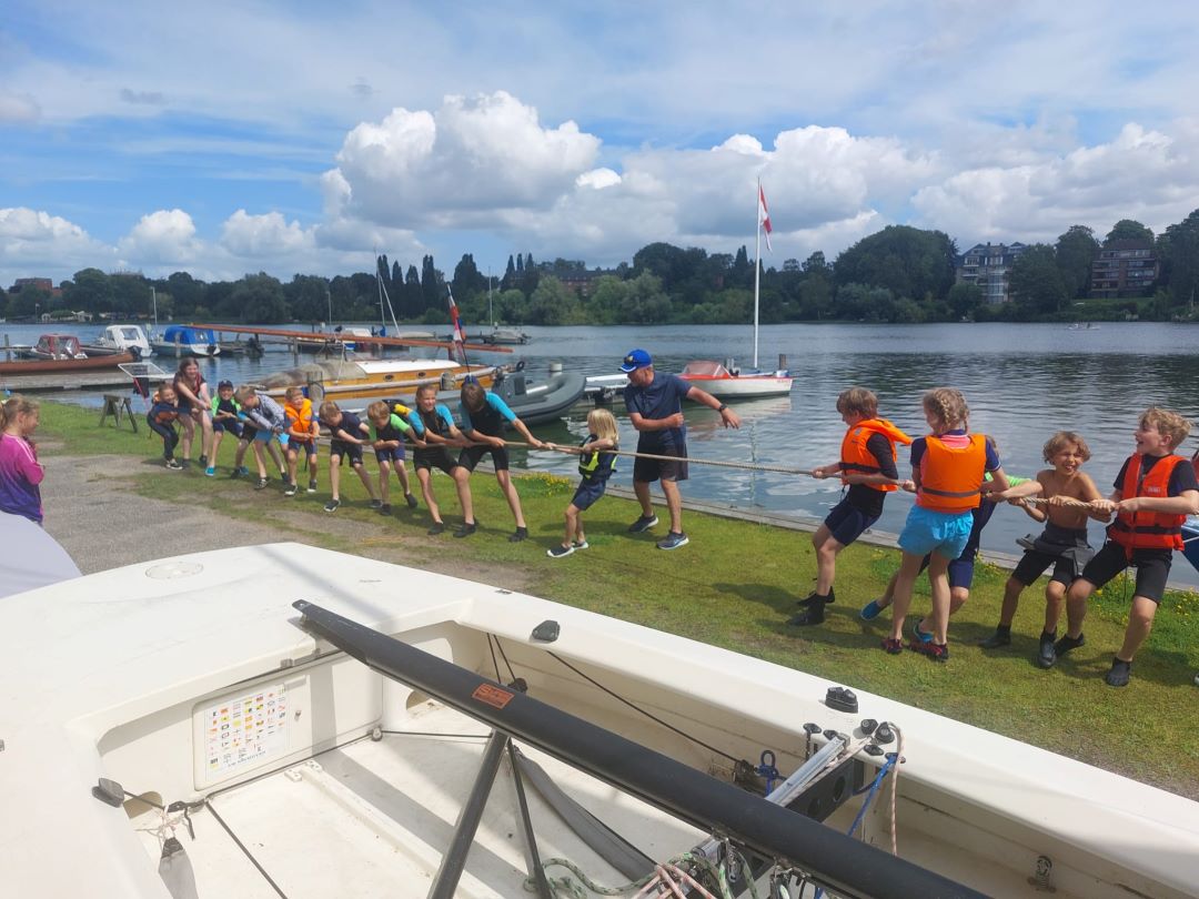 Am Dienstag war für den Nachmittag ein Gewitter angesagt. Das Alternativprogramm an Land war bereits geplant: vormittags nochmal segeln und nach dem Mittag sollten Knoten und die Begriffe der Bootsteile auf dem Programm stehen. Nach dem Mittag war jedoch klar, dass weiter gesegelt werden konnte. Das Gewitter ließ sich noch Zeit. Theorie und Knoten konnten somit auf einen späteren Zeitpunkt verschoben werden. Neben den Optis konnten auch zwei Piraten gesegelt werden, die durch Mieke, Lotta, Nike und Aaron begleitet wurden. Die vier erfahrenen Jugendsegler erklärten dem Nachwuchs hierbei, wie die Boote funktionieren.