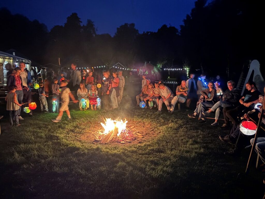 Sobald es zu dämmern begann, folgte der zweite Höhepunkt des Abends: das Laternelaufen. Die Lampions am Wegesrand und in den Händen der Kinder schmückten den Platz und verzauberten ihn geradezu. Nachdem sich alle gesammelt hatten, ging es – begleitet von Berit und ihrem Saxofon – auf einen Rundgang mit vielen schönen und bunten Laternen. Schließlich trafen sich alle am Lagerfeuer wieder, wo Barbara mit ihrem Saxofon musikalisch begleitete, und gemeinsam wurden viele Lieder gesungen – dazu gab es Marshmallows und Stockbrot am Feuer sowie den Schein von Laternen, Wunderkerzen und Sternen am Himmel. Ein wahrlich zauberhafter und schöner Abend, natürlich auch begünstigt durch das traumhafte und milde Wetter.