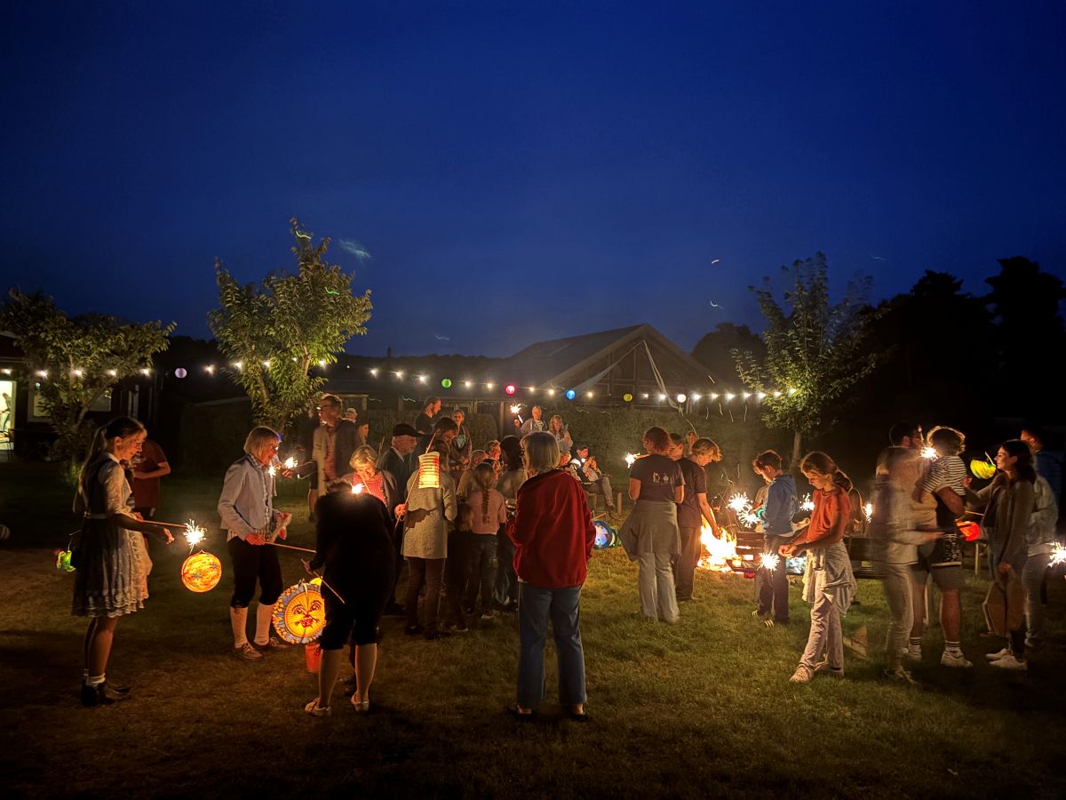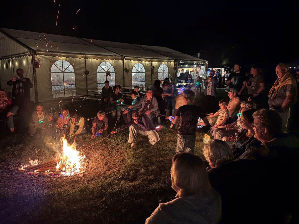 Sobald es zu dämmern begann, folgte der zweite Höhepunkt des Abends: das Laternelaufen. Die Lampions am Wegesrand und in den Händen der Kinder schmückten den Platz und verzauberten ihn geradezu. Nachdem sich alle gesammelt hatten, ging es – begleitet von Berit und ihrem Saxofon – auf einen Rundgang mit vielen schönen und bunten Laternen. Schließlich trafen sich alle am Lagerfeuer wieder, wo Barbara mit ihrem Saxofon musikalisch begleitete, und gemeinsam wurden viele Lieder gesungen – dazu gab es Marshmallows und Stockbrot am Feuer sowie den Schein von Laternen, Wunderkerzen und Sternen am Himmel. Ein wahrlich zauberhafter und schöner Abend, natürlich auch begünstigt durch das traumhafte und milde Wetter.