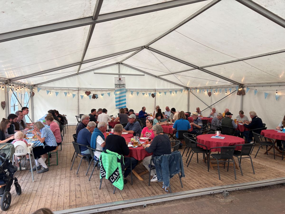 An einem sommerlichen Wochenende Ende September hieß es nicht nur in München „O’zapft is“, sondern auch bei uns am See. In einem festlich blau-weiß geschmückten Zelt kamen am Abend rund 100 Erwachsene und Kinder zusammen, um sich bayerisches Essen und Hot Dogs für die Kinder schmecken zu lassen. Das bayerische, selbst zubereitete Buffet aus Leberkäse, Weißwurst, vegetarischem und nicht-vegetarischem Sauerkraut, vegetarischer Schupfnudel-Pfanne, Laugengebäck, Kartoffelsalat, Radi und bayerischem Nudelsalat ließ keine Wünsche offen. Und aufgrund vieler Nachfragen sei ein „Geheimnis“ gelüftet: Das Sauerkraut wurde auf Basis von Karins Rezept zubereitet – seit vielen Jahren wird es in der Familie weitergegeben und nun von Jan gekocht.