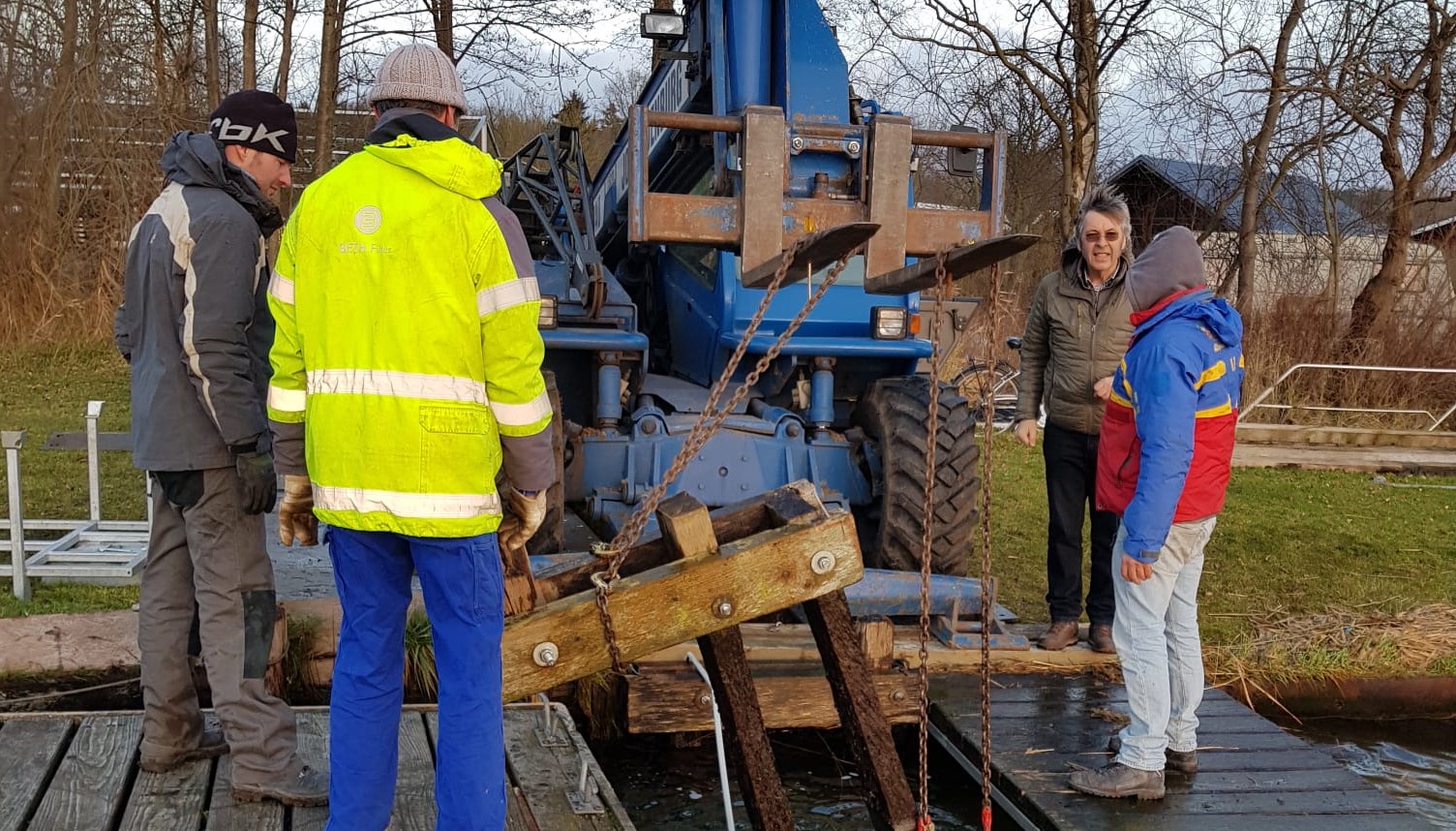 Gleich im Neuen Jahr 2020 wurde am 18. Januar der erste Großeinsatz mit schwerem Gerät – Reparaturarbeiten an der Hauptbrücke – gestartet. Unter Mitarbeit von Jens, Olli, Hans und Klaus wurden mit Hilfe eines Krans alte, morsche Pfähle gezogen.